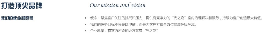 2012年公司斥巨資從德國專業空氣研發(fā)實驗室引進銳鈦型納米二氧化鈦研發(fā)成果,同時與國內知名高校進行合作,成立“光之吻”品牌,致力于為人類創(chuàng)作純凈,健康的呼吸環(huán)境,成為你身邊的健康衛(wèi)士,實現365天健康呼吸的夢想,目前是同類產品中最有競爭力的品牌之一。